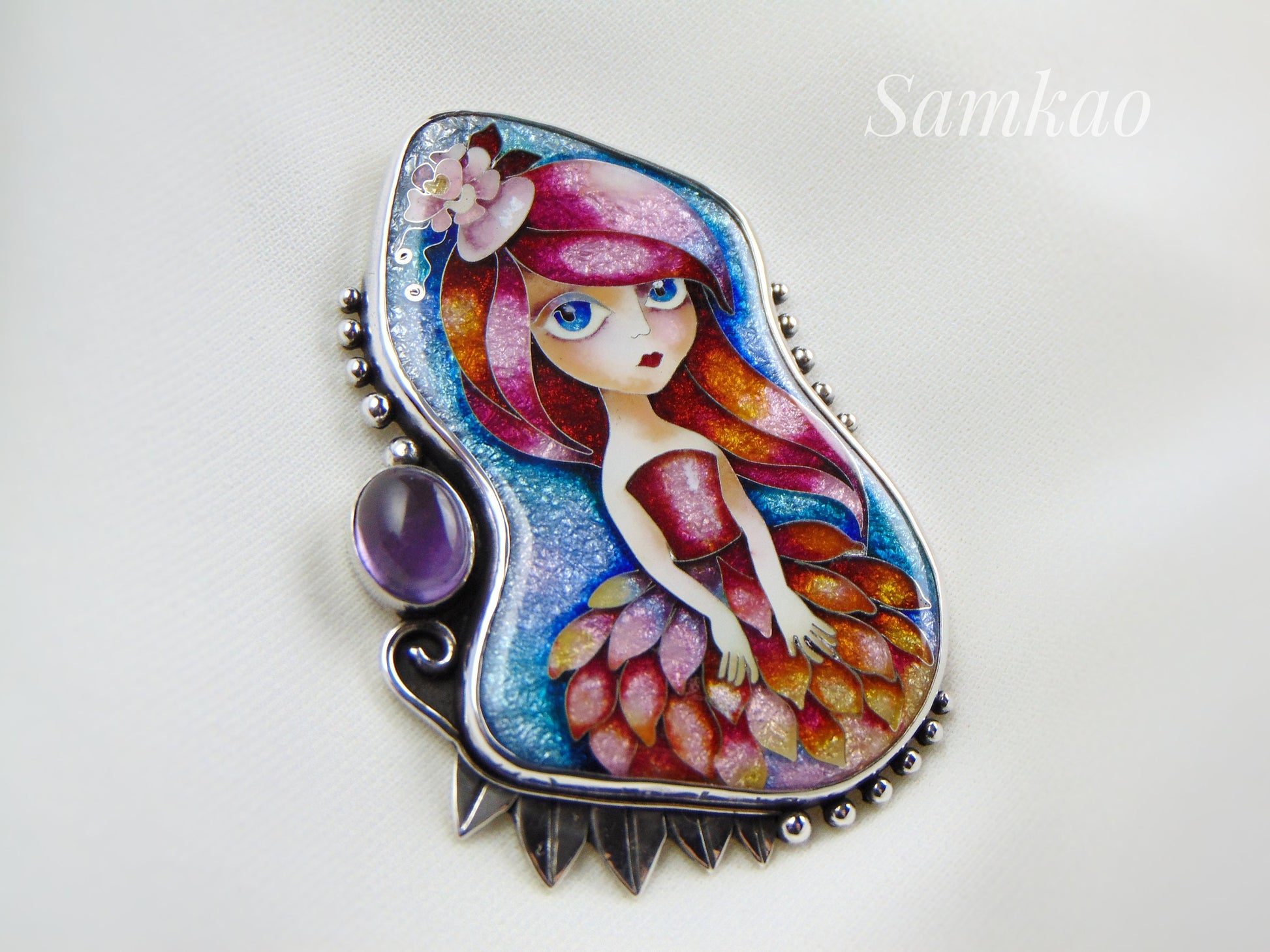 Pink ballerina pendant,Georgian cloisonne enamel jewelry,Fantasy Gift,Gifts for Her,Fairy pendant,Sterling silver,One of a kind jewelry