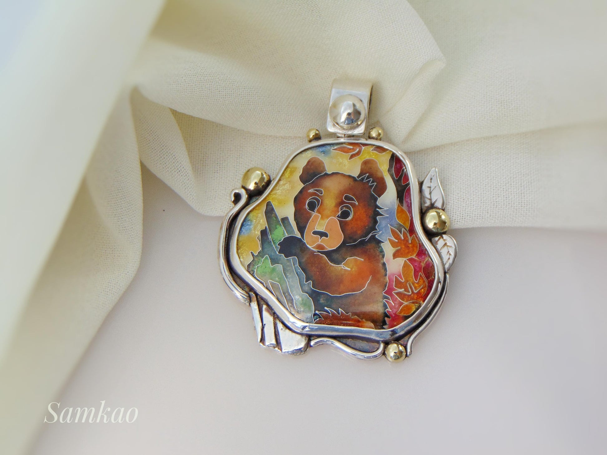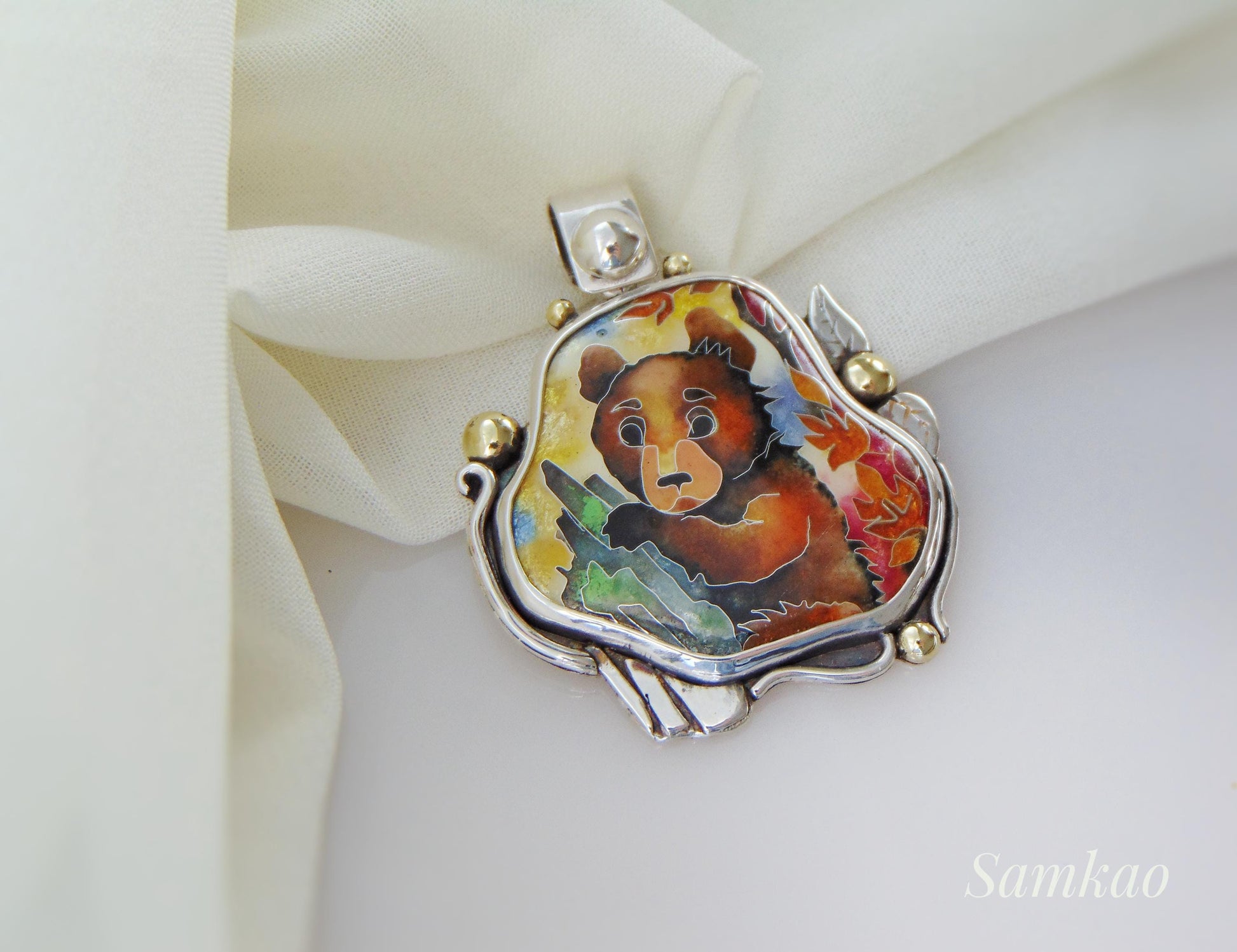 Brown bear pendant, Cloisonne enamel, Sterling silver necklace, Handmade jewelry