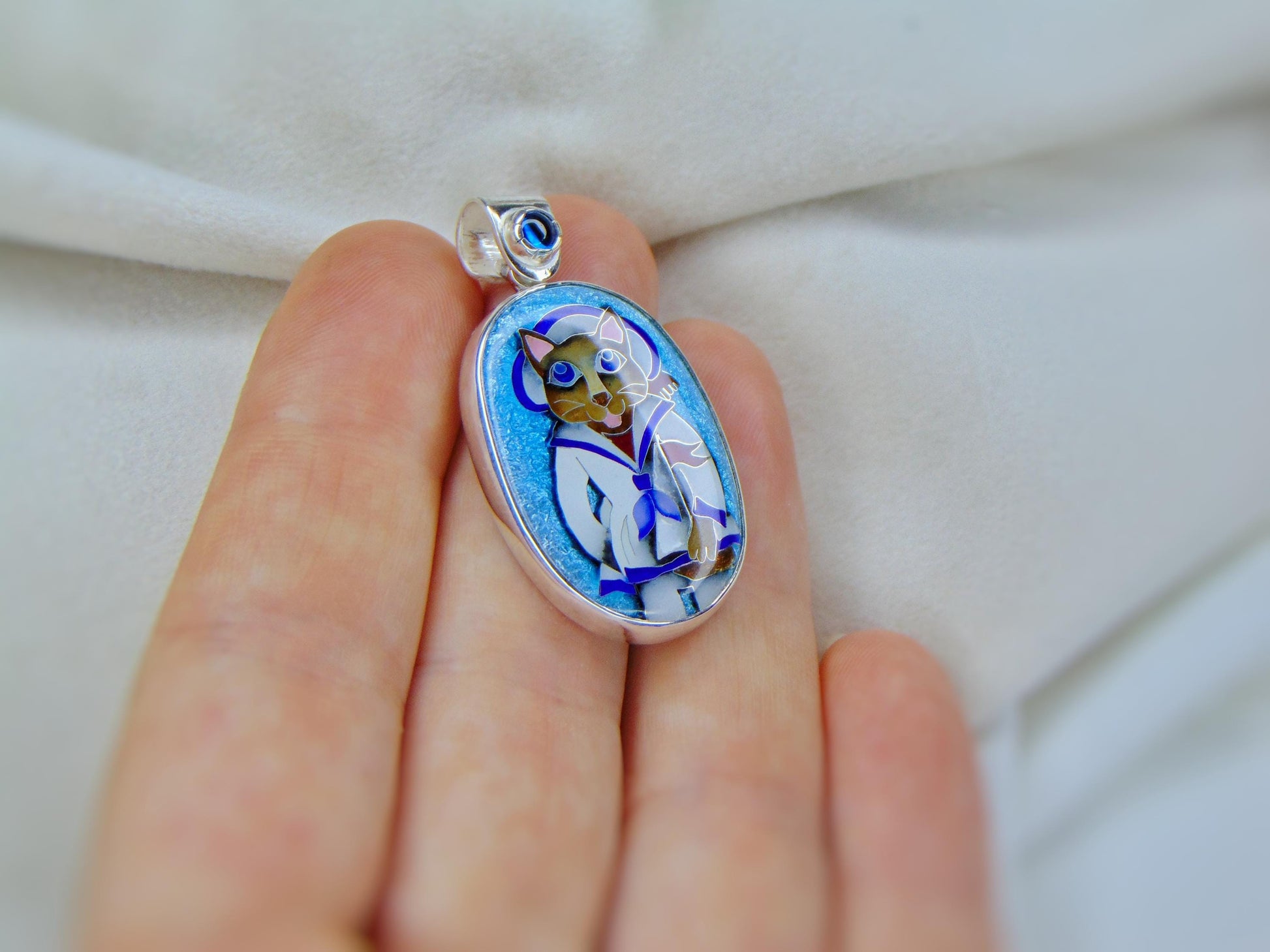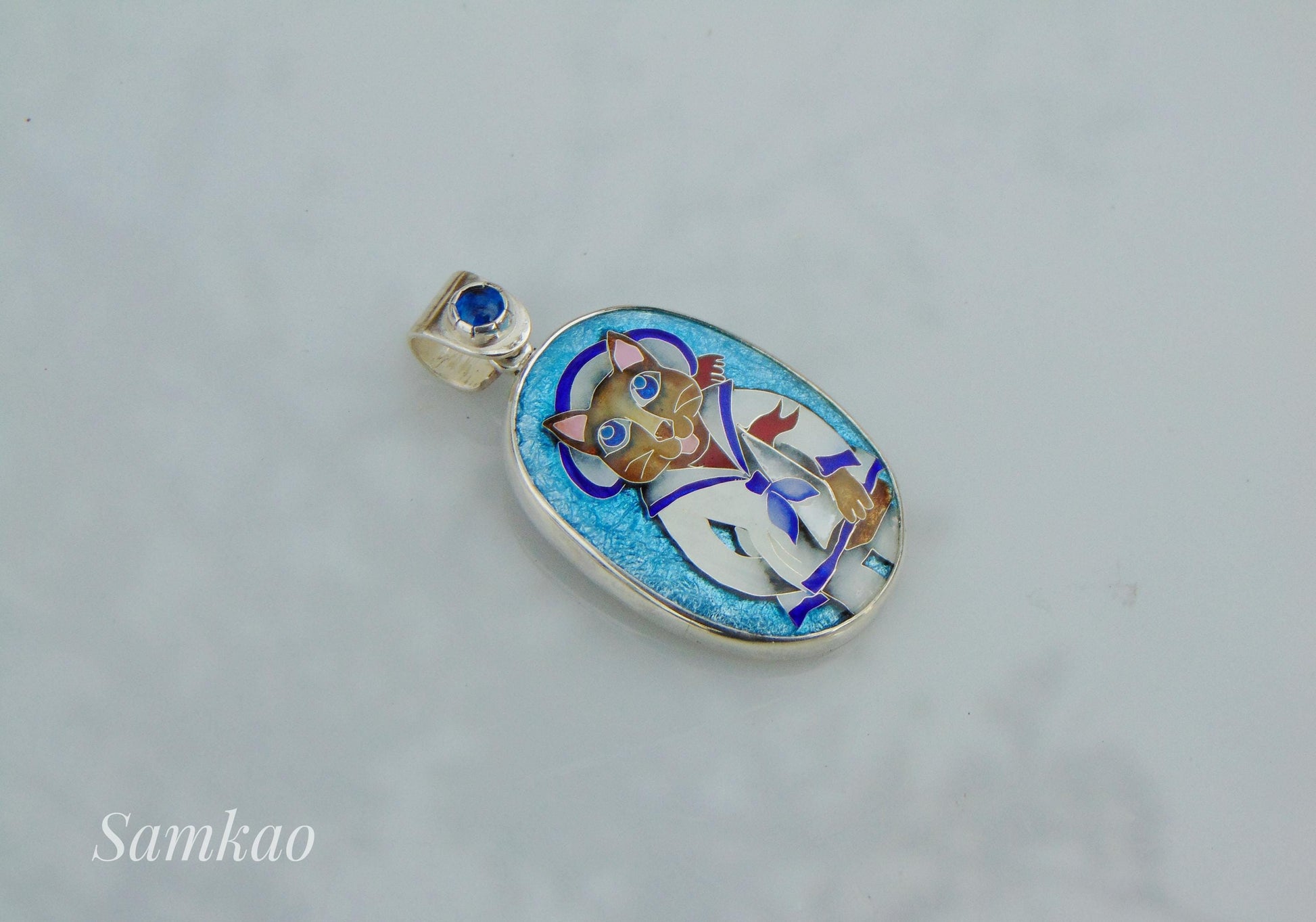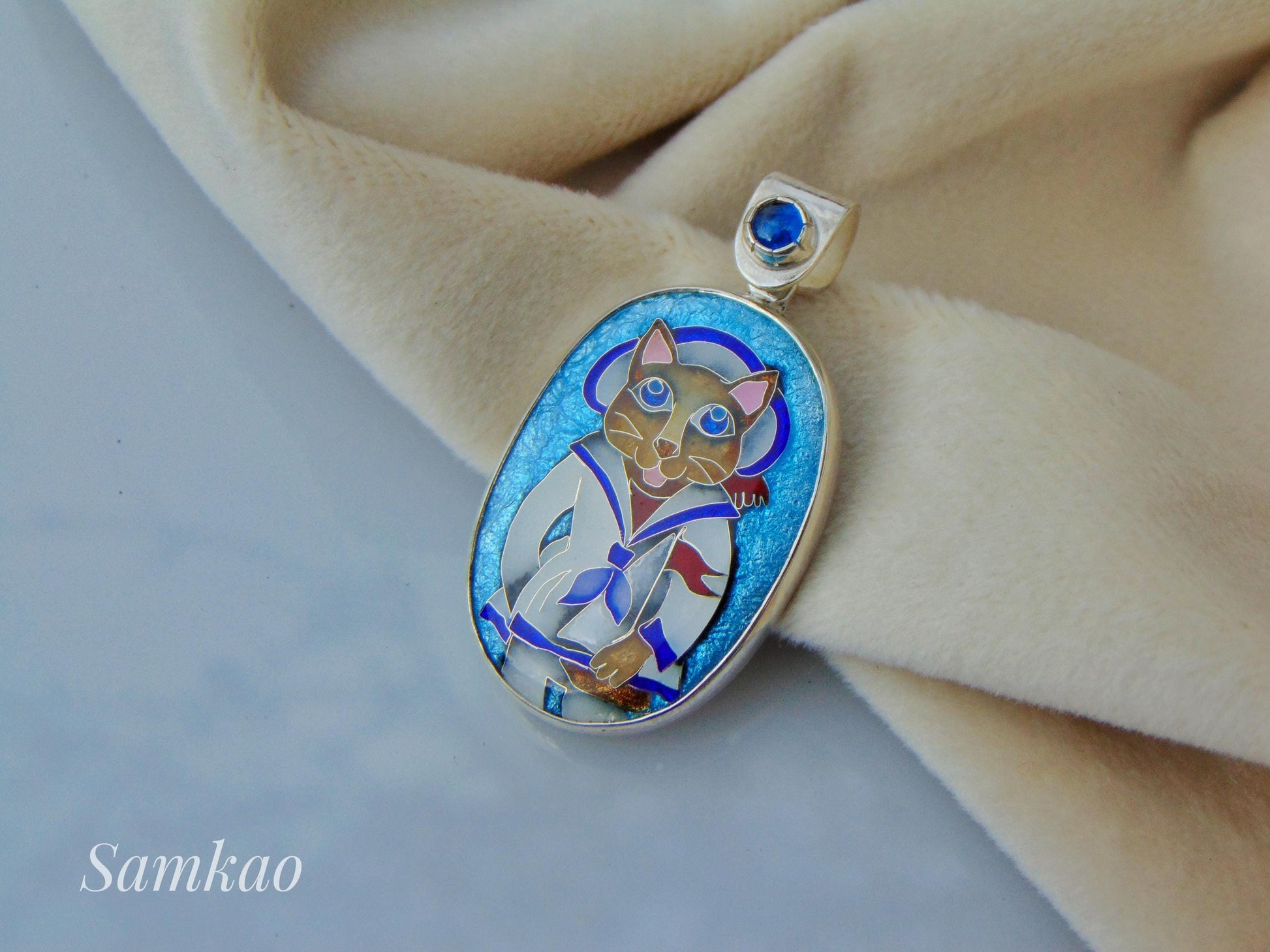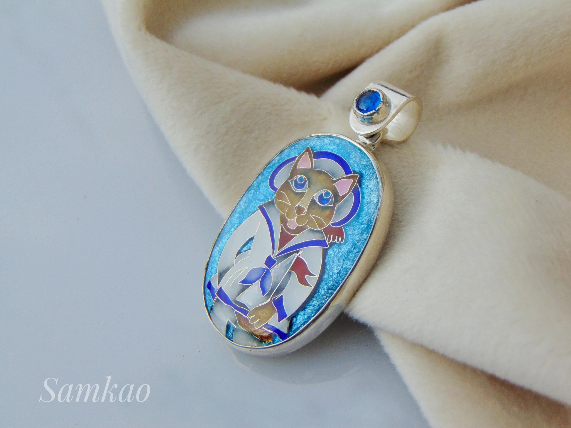 Cloisonné Enamel Cat Sailor Pendant – Silver Frame with Blue Gemstone – Handmade Enamel Jewelry