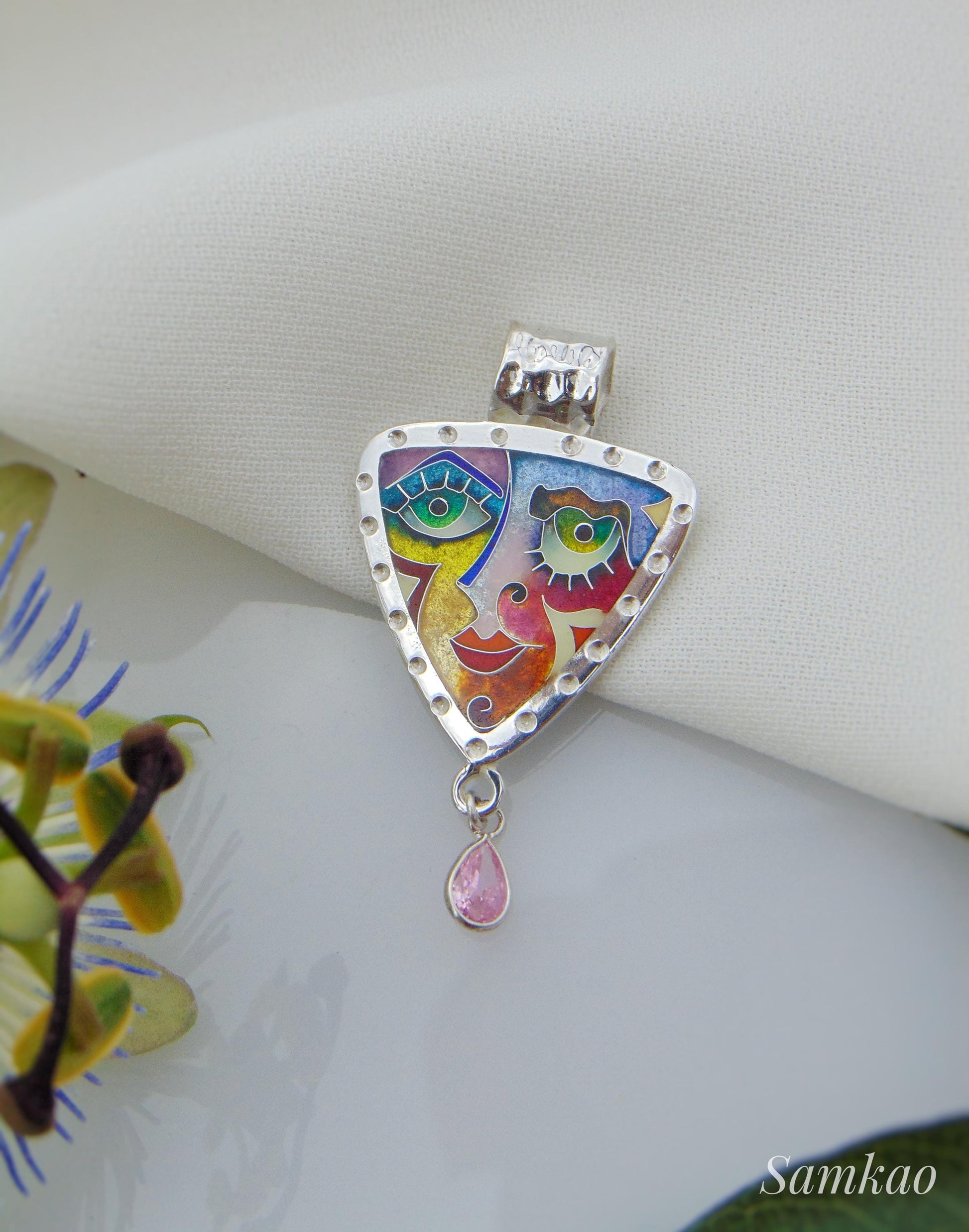 Colorful Cloisonné Enamel Pendant,Abstract Face Jewelry,Handmade Sterling Silver Necklace,Art Jewelry,Gift for Her,Unique Statement piece
