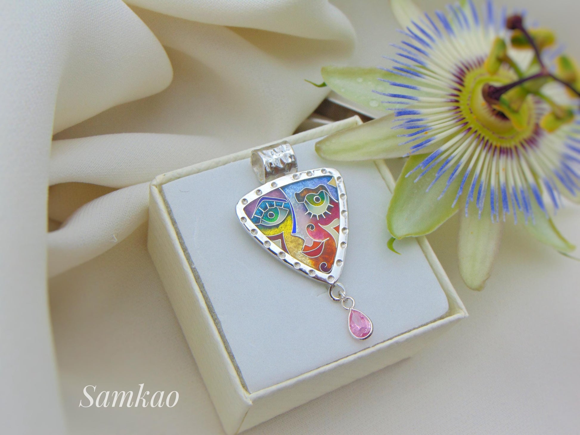 Colorful Cloisonné Enamel Pendant – Abstract Face Jewelry – Handmade Sterling Silver Necklace – Art Jewelry – Gift for Her – Unique Statement Piece