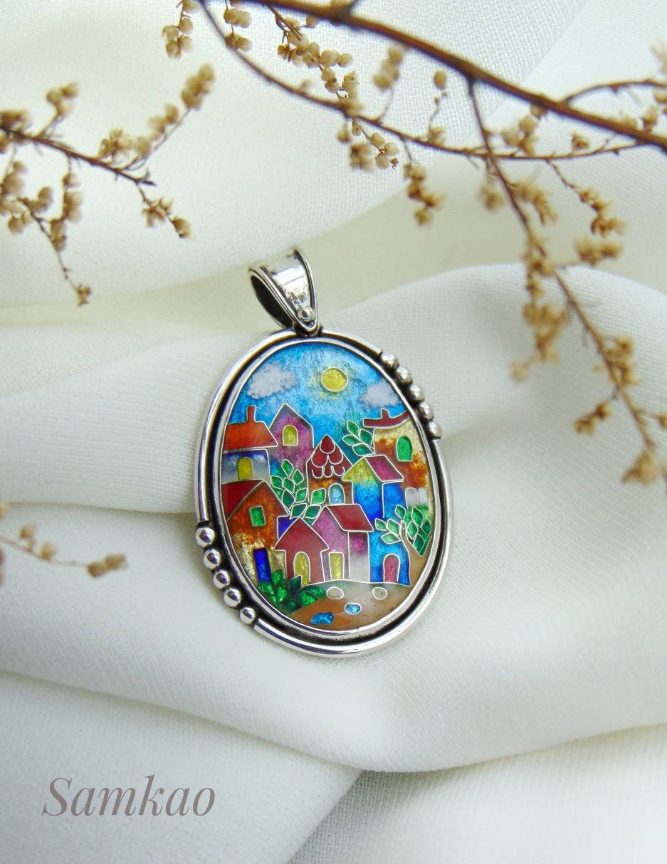 Colorful houses, Georgian Cloisonne enamel pendant, Handmade jewelry,Sterling silver 925 , Colorful jewelry,Artisan jewelry