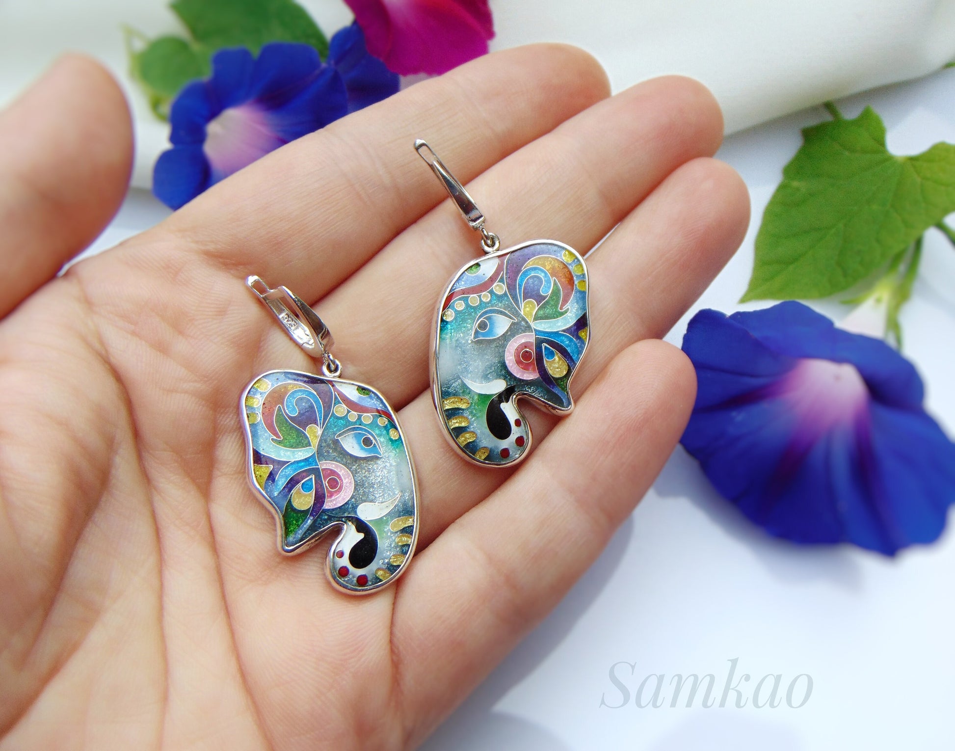 Elephant earrings,Cloisonne enamel,Sterling silver,Handmade jewelry,Silver 950,Gift for her,Elephant jewelry, Silver Animal Earrings