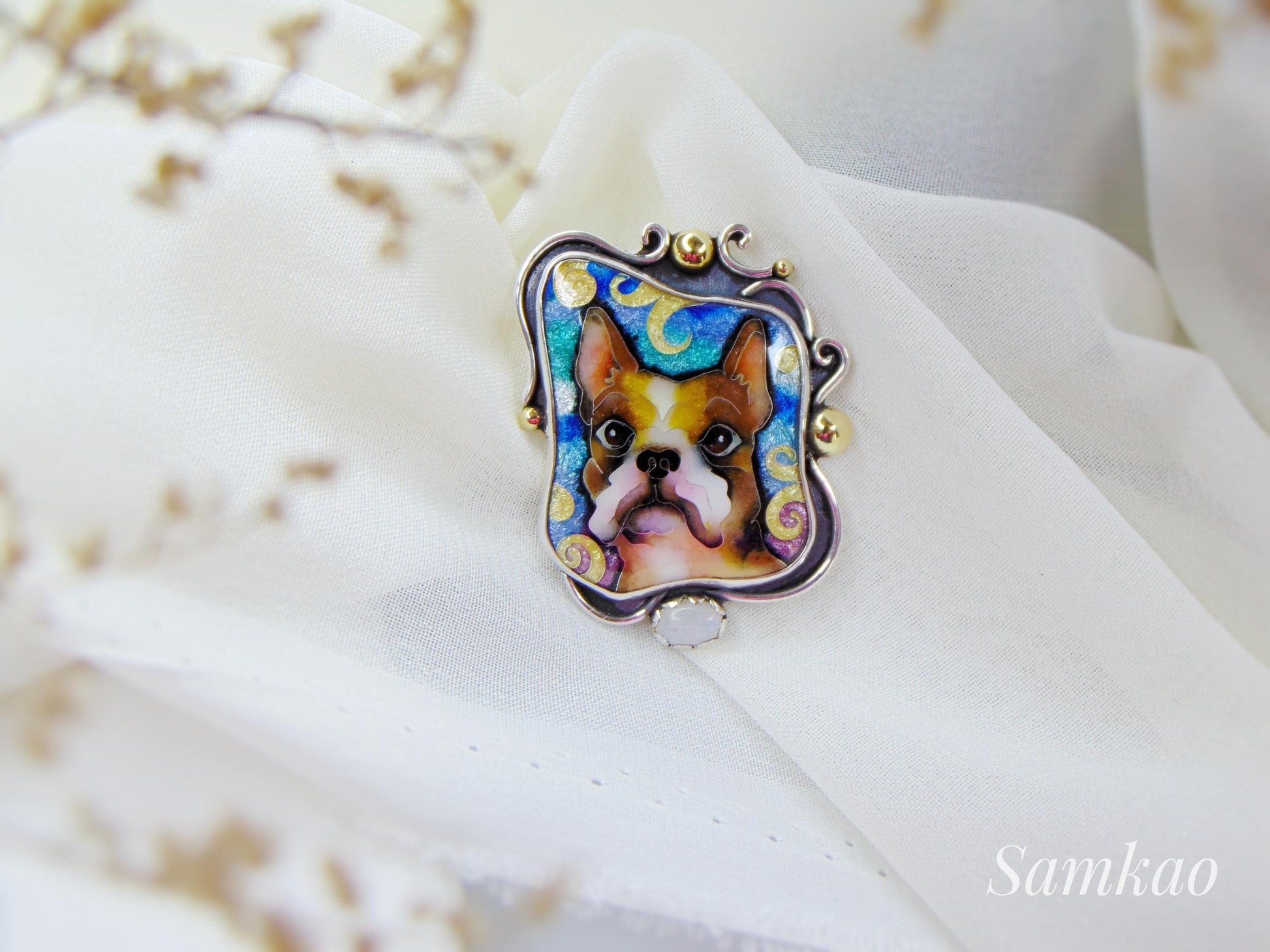 French bulldog necklace,Cloisonne enamel jewelry,Sterling silver, Moonstone,Frenchie Pendant,Pet lover gift