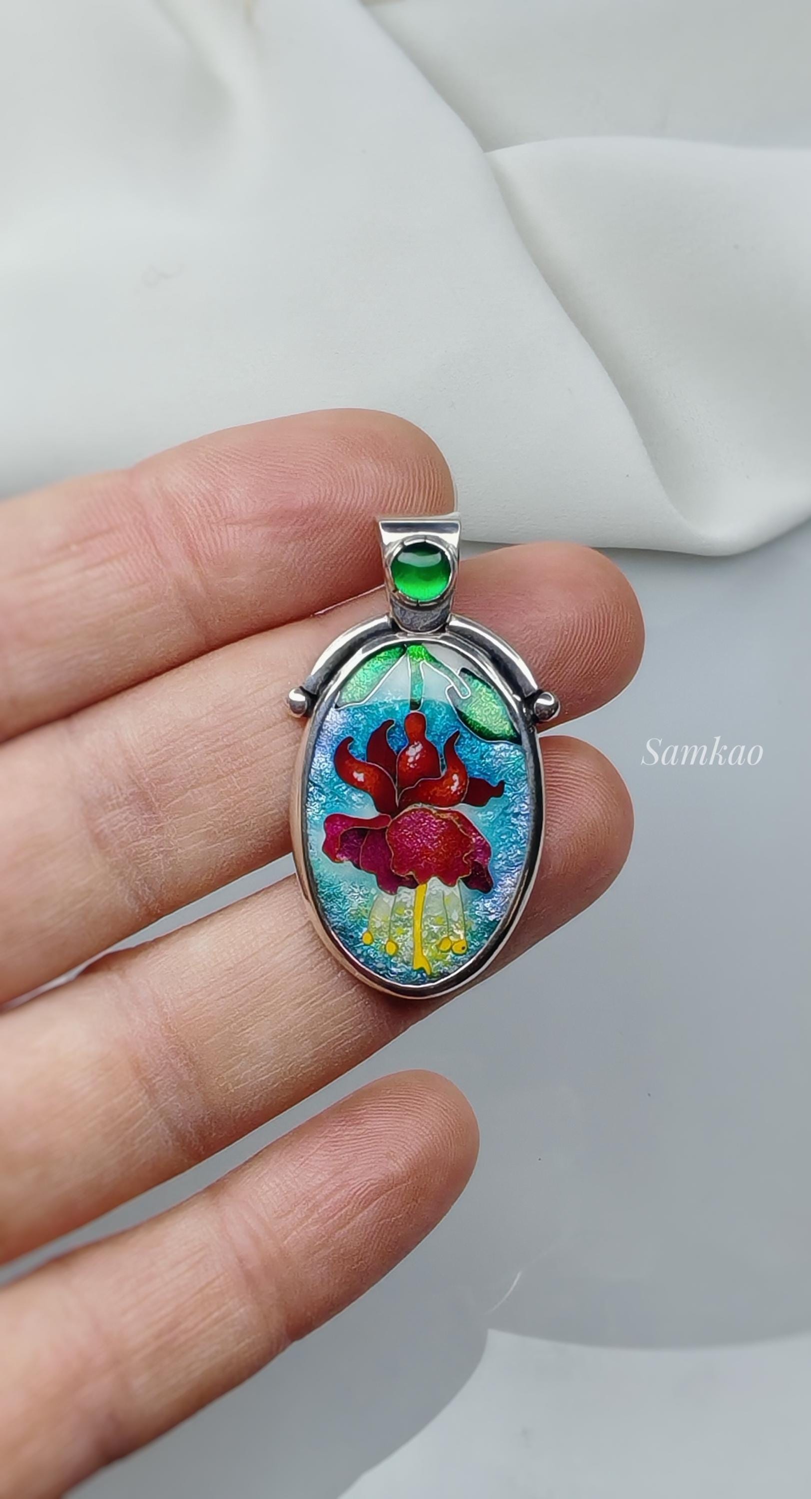 Fuchsia flower pendant, Cloisonne enamel jewelry,Sterling silver, Green gemstone