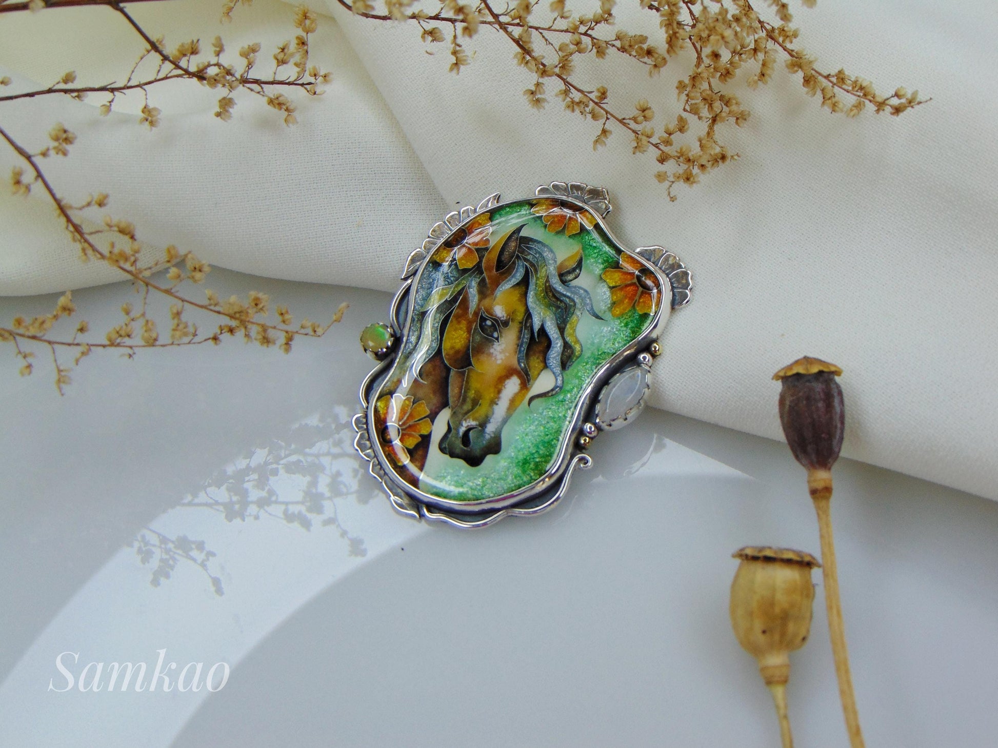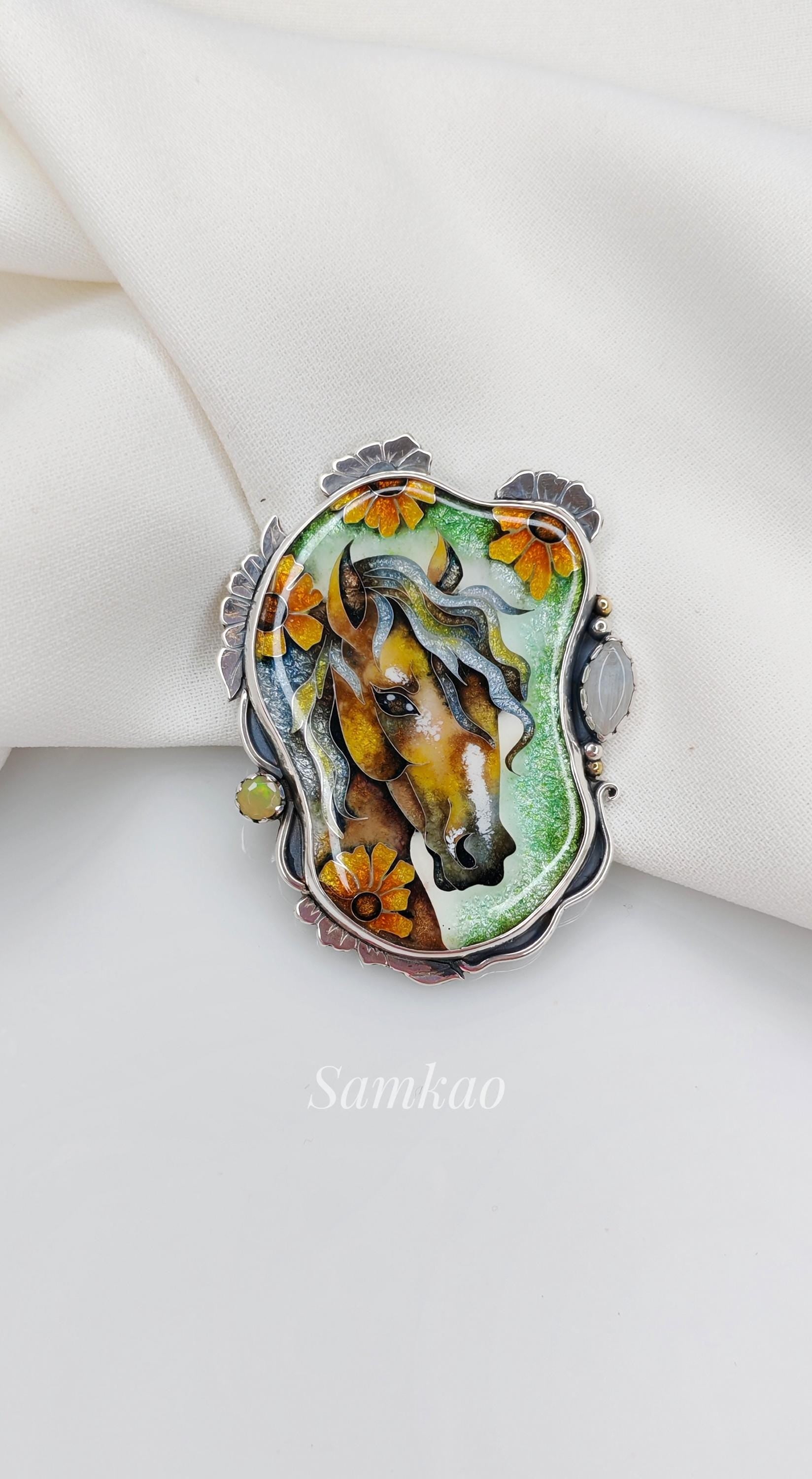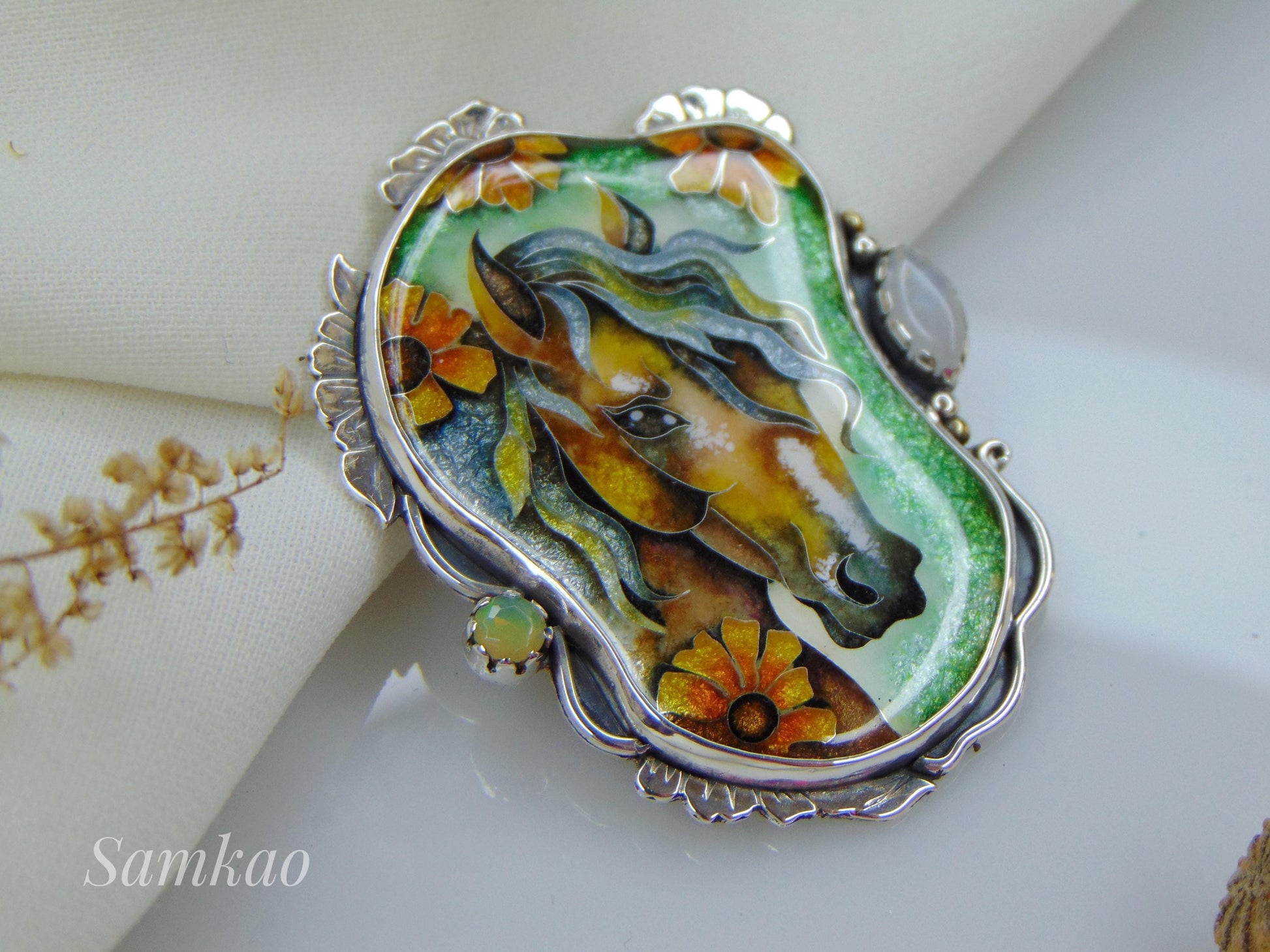 Horse pendant,Cloisonne enamel jewelry, Opals necklace, Horse lover gift, Sunflower pendant, Handmade Sterling silver jewelry, Moonstone pendant