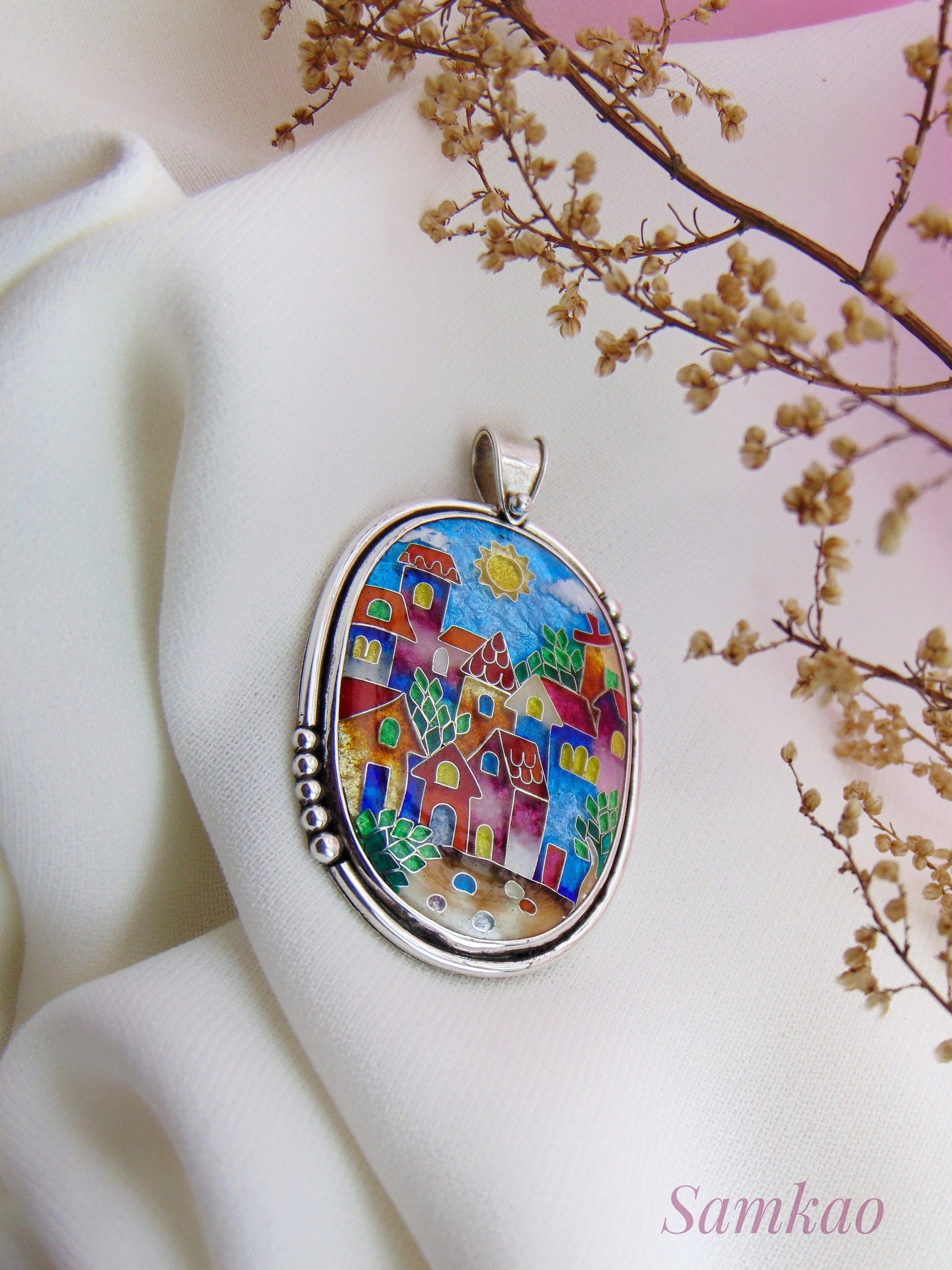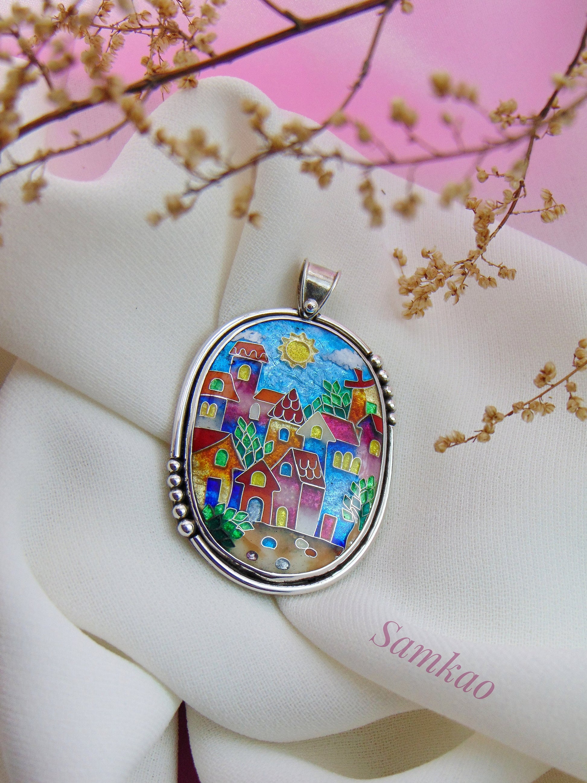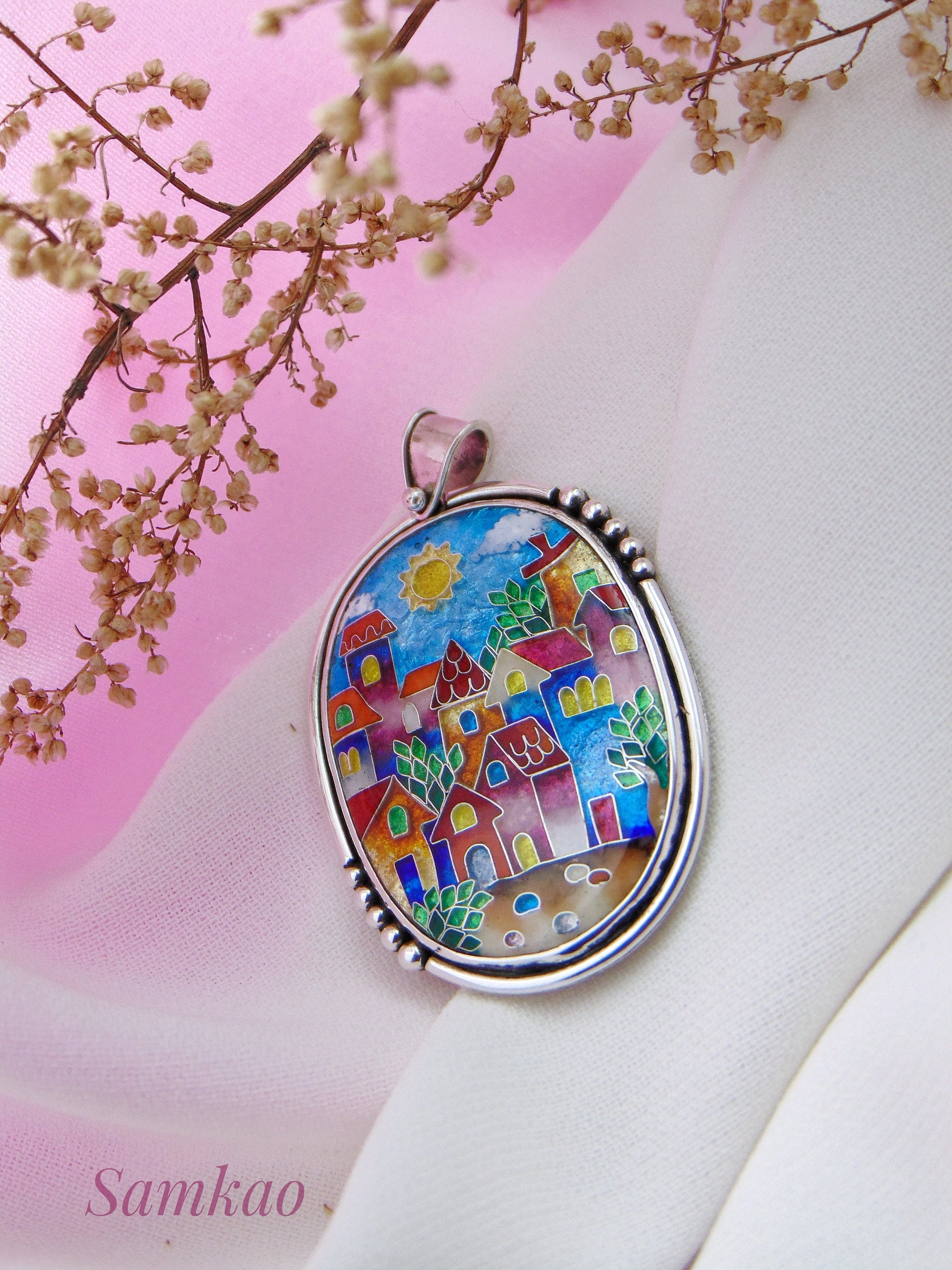 Pendant with colorful houses, Cloisonne enamel jewelry, one of a kind cloisonne enamel pendant, gift for her, Sterling silver