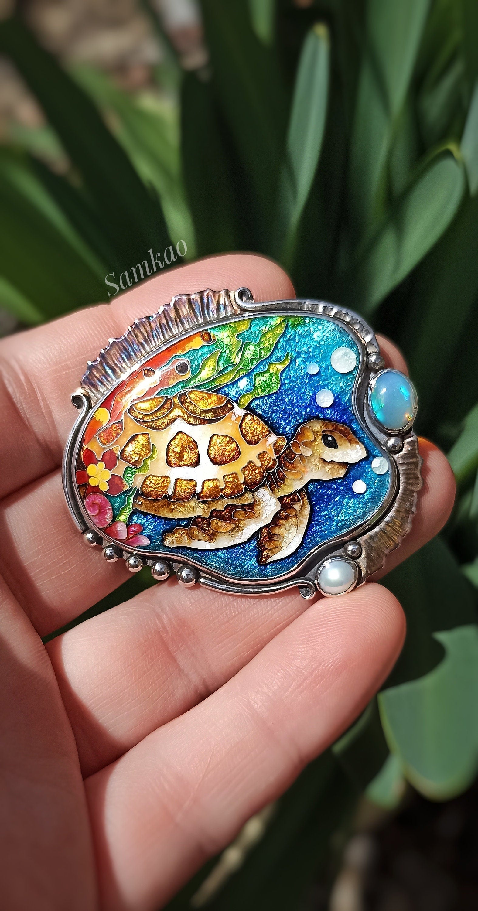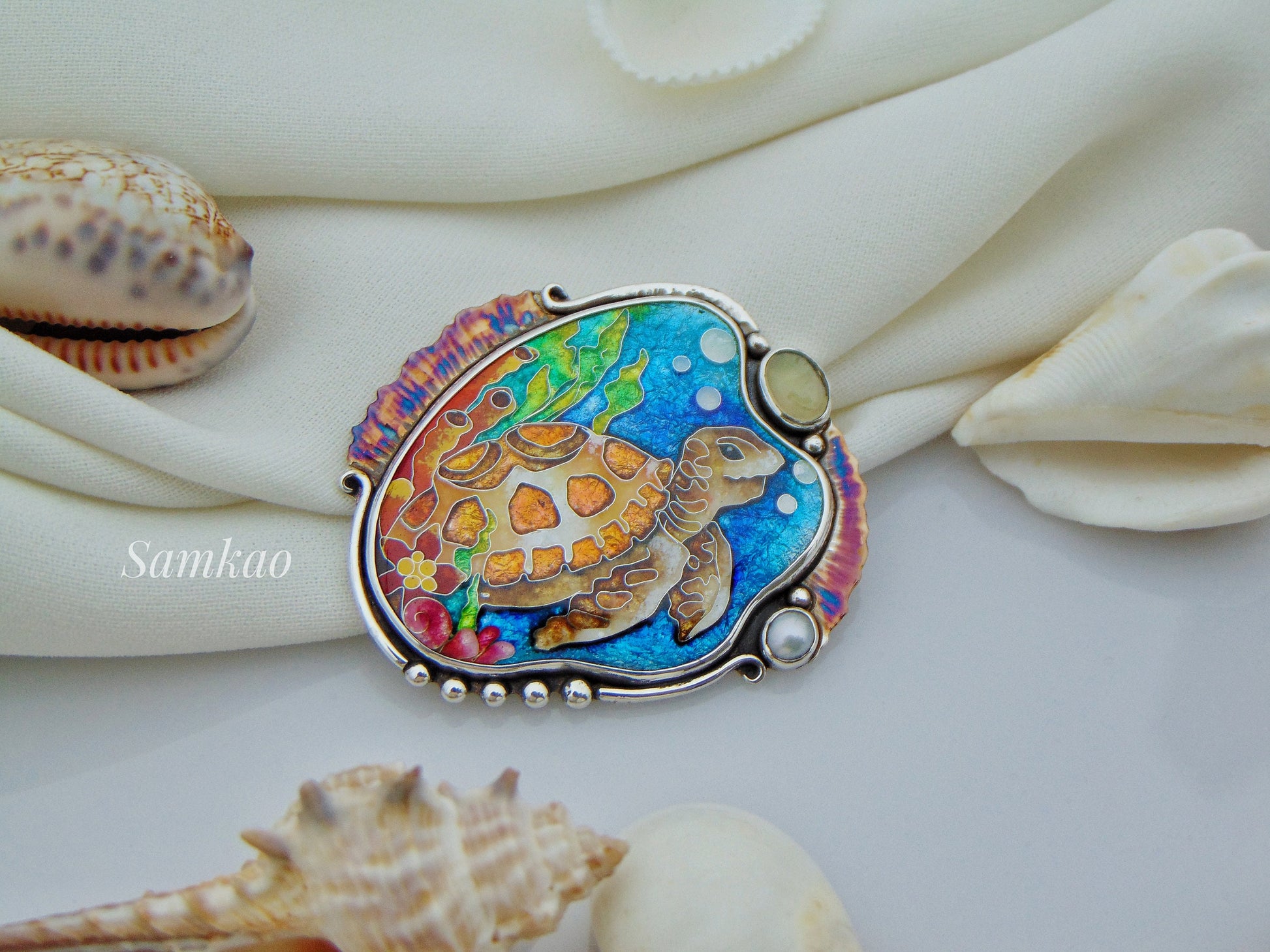 Sea turtle pendant,Georgian cloisonne enamel jewelry,Sterling silver, Moonstone, Mystic topaz,Sea creatures, Turtle jewelry