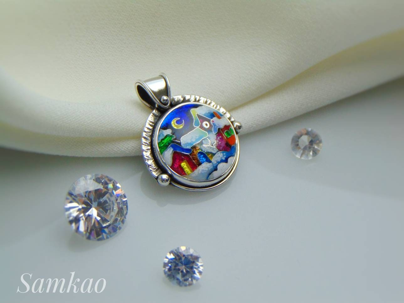 Snowy house pendant,Cloisonne enamel jewelry,Sterling silver, Christmas houses pendant, Handmade jewelry