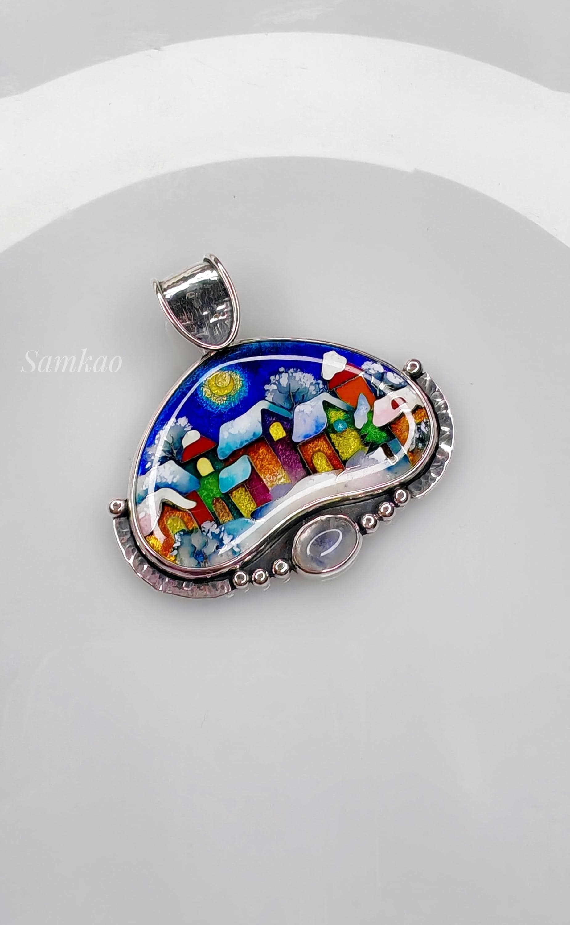 Snowy houses pendant,Christmas jewelry,Sterling silver,Georgian cloisonne enamel,Vitreous enamel,Moonstone pendant,Glass enamel